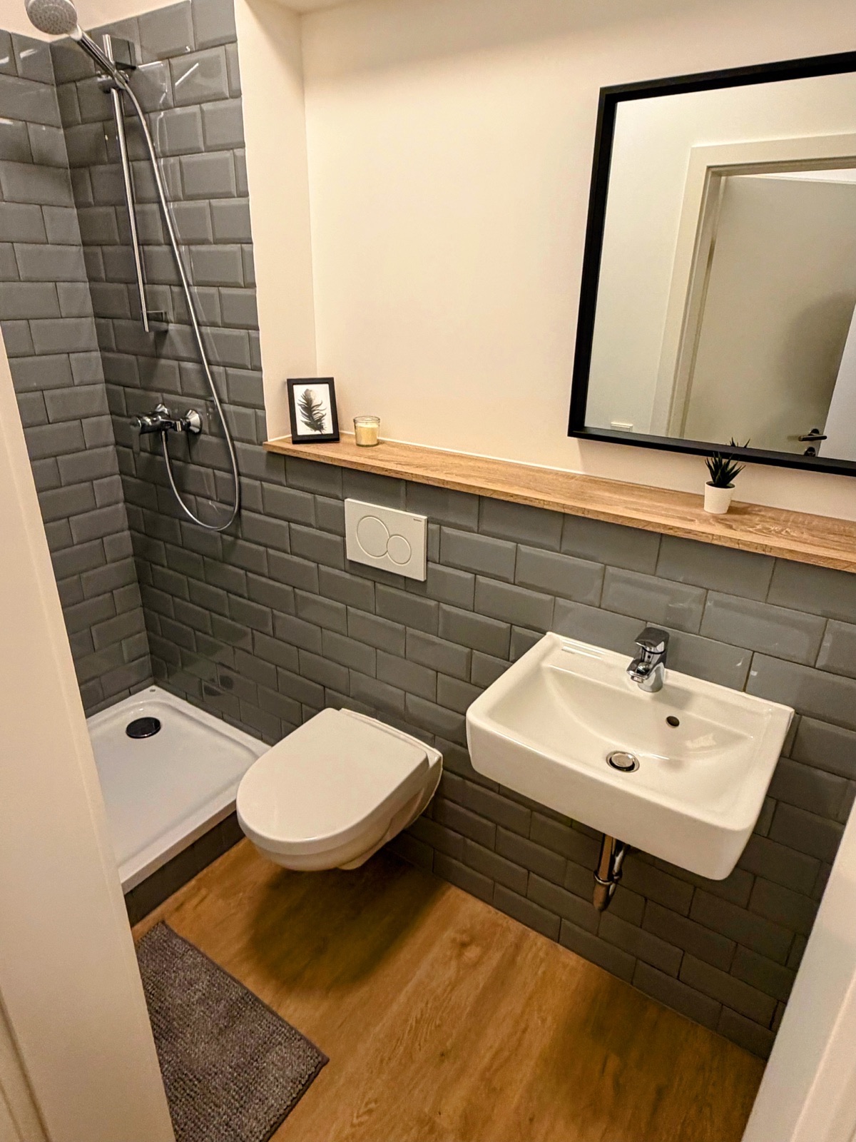 S-Bahn direkt vor der Tür. REWE 1 Minute.